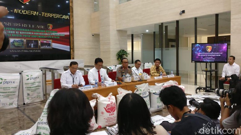 Bareskrim Polisi Republik Indonesia menjelaskan pengungkapan peredaran gula rafinasi. Sebanyak 30 ton gula rafinasi disita. (Audrey/detikcom)Jakarta -Direktorat Tindak Pidana Umum (Dittipidum) Bareskrim Polisi Republik Indonesia menangkap lima anggota sindikat peredaran gula rafinasi ke masyarakat. Sebanyak 30 ton gula rafinasi disita dari para tersangka. Gula rafinasi ini seharusnya diperuntukkan buat industri, tapi para tersangka menjualnya untuk konsumsi masyarakat.