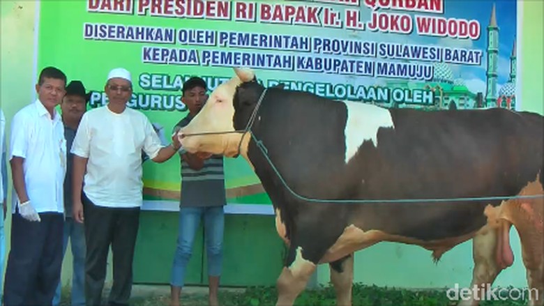 Sapi kurban Presiden Jokowi di Mamuju. (Abdy/detikcom)Mamuju -Presiden Jokowi memperlihatkan seekor sapi untuk kurban di Kabupaten Mamuju, Sulawesi Barat. Sapi itu berjenis Simental, dengan berat 1,050 ton.
